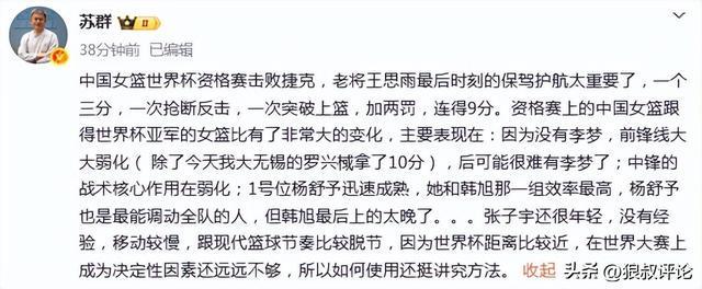 中国女篮世界杯资格赛击败捷克,老将王思雨最后时刻的保驾护航太重要了,一个三分,一次抢断反击,一次突破上篮,加两罚,连得9分。资格赛上的中国女篮跟得世界杯亚军的女篮比有了非常大的变化,主要表现在:因为没有李梦,前锋线大大弱化( 除了今天我大无锡的罗兴棫拿了10分),后面可能很难有李梦了;中锋的战术核心作用在弱化;1号位杨舒予迅速成熟,她和韩旭那一组效率最高,杨舒予也是最能调动全队的人,但韩旭最后上得太晚了。